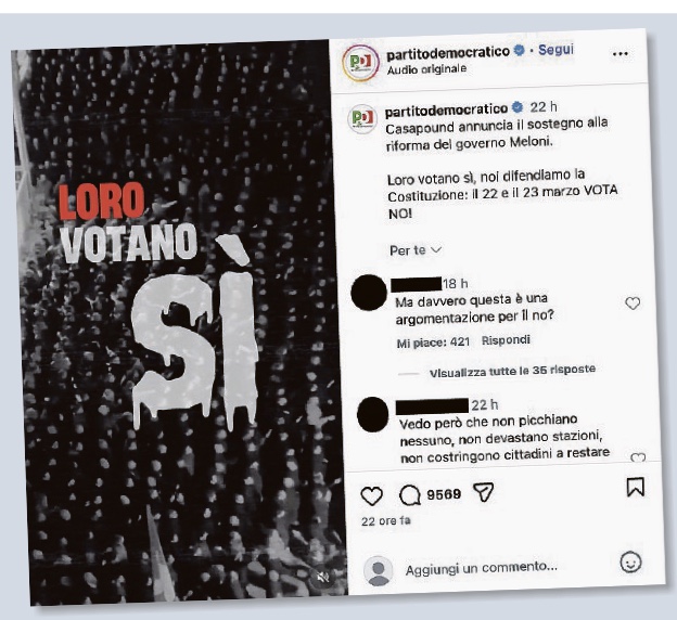 Un manifesto Pd vergognoso, come ha rilevato la riformista Pina Picierno. Equipara il Sî a Casa Pound e al voto dei fascisti. Anche il nonno della Schlein, il sen. Agostino Viviani, socialista, era fa...